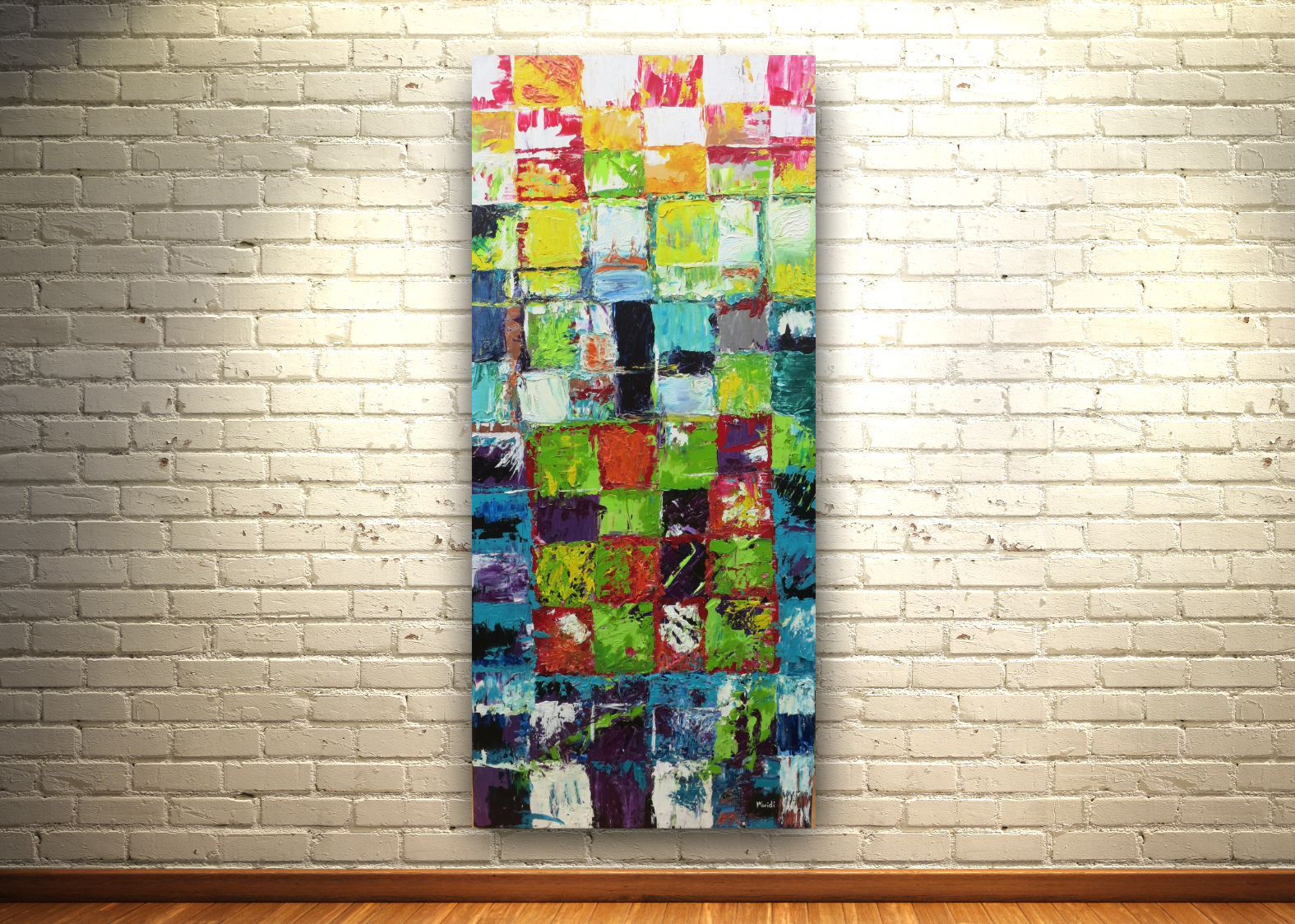 Des carrés qui ne sont pas parfaits, des carrés qui deviennent rectangles, des textures qui se gonflent, des textures qui s’effacent, des couleurs qui s’animent et qui veulent dépasser les frontières. La simplicité d’être c’est accepter les couleurs de ses pensées. « Carrément vertical » est l’émergence d’une liberté encadrée, diluant ses cadres, et pigmentant un détachement en voie de transformation. Se penser libre sans l’être est une vie fantôme en dessous d’une ossature de coloris.
