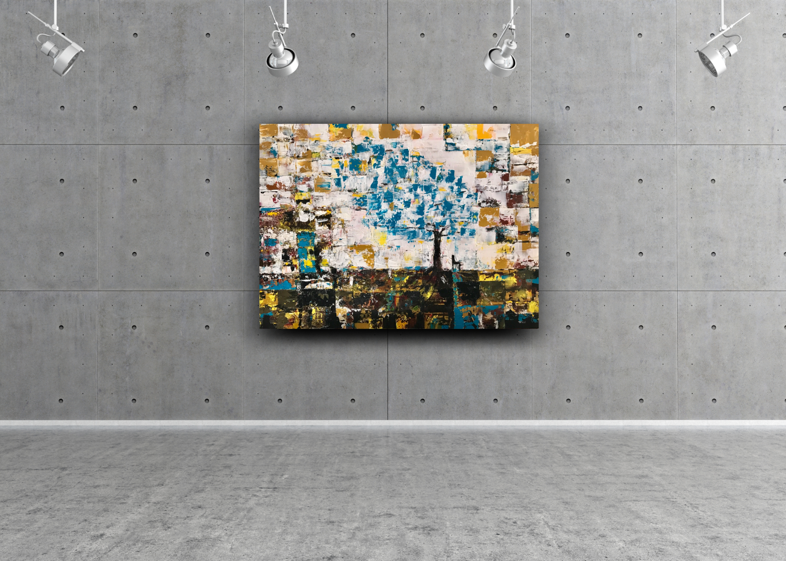 « Simplicité volontaire » est une oeuvre qui ouvre la porte à l’introspection et à la réflexion. Le refuge, l’arbre et la chaise invitent le regard à s’attarder à l’essentiel; se reconnecter avec la nature. Les carrés se déplacent avec le vent et reforment un nouveau paysage. Ils représentent la confusion, les illusions, la peur de la solitude, l’inconfort du silence et les difficultés à percevoir le véritable bonheur. L’être humain, derrière ses fenêtres, ne serait-il pas plus heureux davantage dehors?