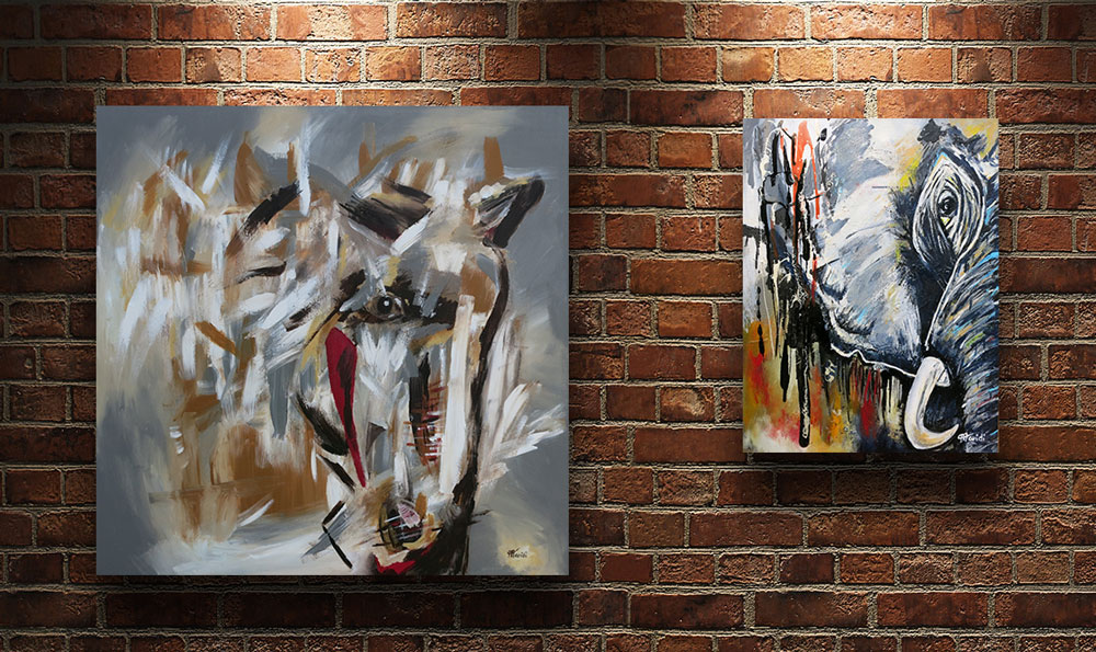 A contemporary work that exudes the captivating warmth of a savannah for the viewer to discover. The colours sweat and slip on the identity of a life that is wild yet tame. The sign of a disappearing wilderness in need of protection, the curious elephant gets closer, hoping that his appearance will impart wisdom and inspire a sense of urgency.